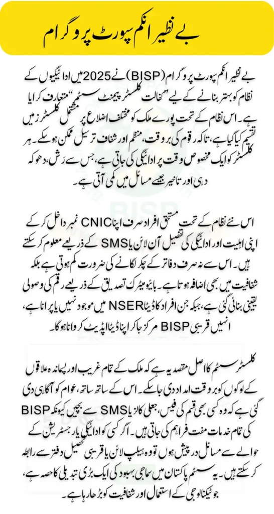 The Cluster Payment System introduced by BISP in 2025 is designed to divide the country into specific clusters each made up of multiple districts. Payments are processed and delivered cluster by cluster rather than all over the country at once.