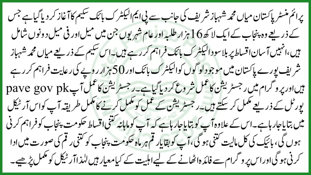 Prime Minister of Pakistan Mian Muhammad Shahbaz Sharif has launched the PM Electric Bike Scheme 2025, through which he is providing interest-free electric bikes to 116,000 students and ordinary citizens of Punjab, including both mail and per-mail, on easy installments. Through this scheme, Mian Muhammad Shahbaz Sharif is providing electric bikes and a discount of Rs 50,000 to people across Pakistan, and the registration process for the program has started. You can complete the registration process through the “pave gov pk” portal.